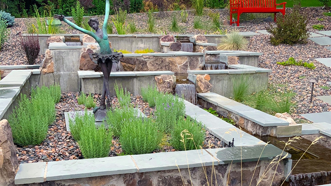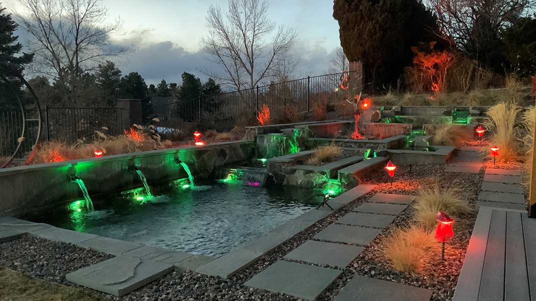 Dedicated koi pond with clean lines and multiple levels, providing an ambiance of stately elegance in a formal setting. Winner of Pond Trade Magazine’s Water Artisans of the Year Winners for the Hardscapes Combo award. Also included is an advanced filtration system that keeps this feature pristine on a perpetual basis. The surrounding hardscape motif is inspired by Denver’s Clyfford Still Museum, giving a nod to the late artist’s trademark abstract expressionism. Water-wise with meaningfully placed flora, this masterpiece embodies western simplicity with a flair for the unconventional.